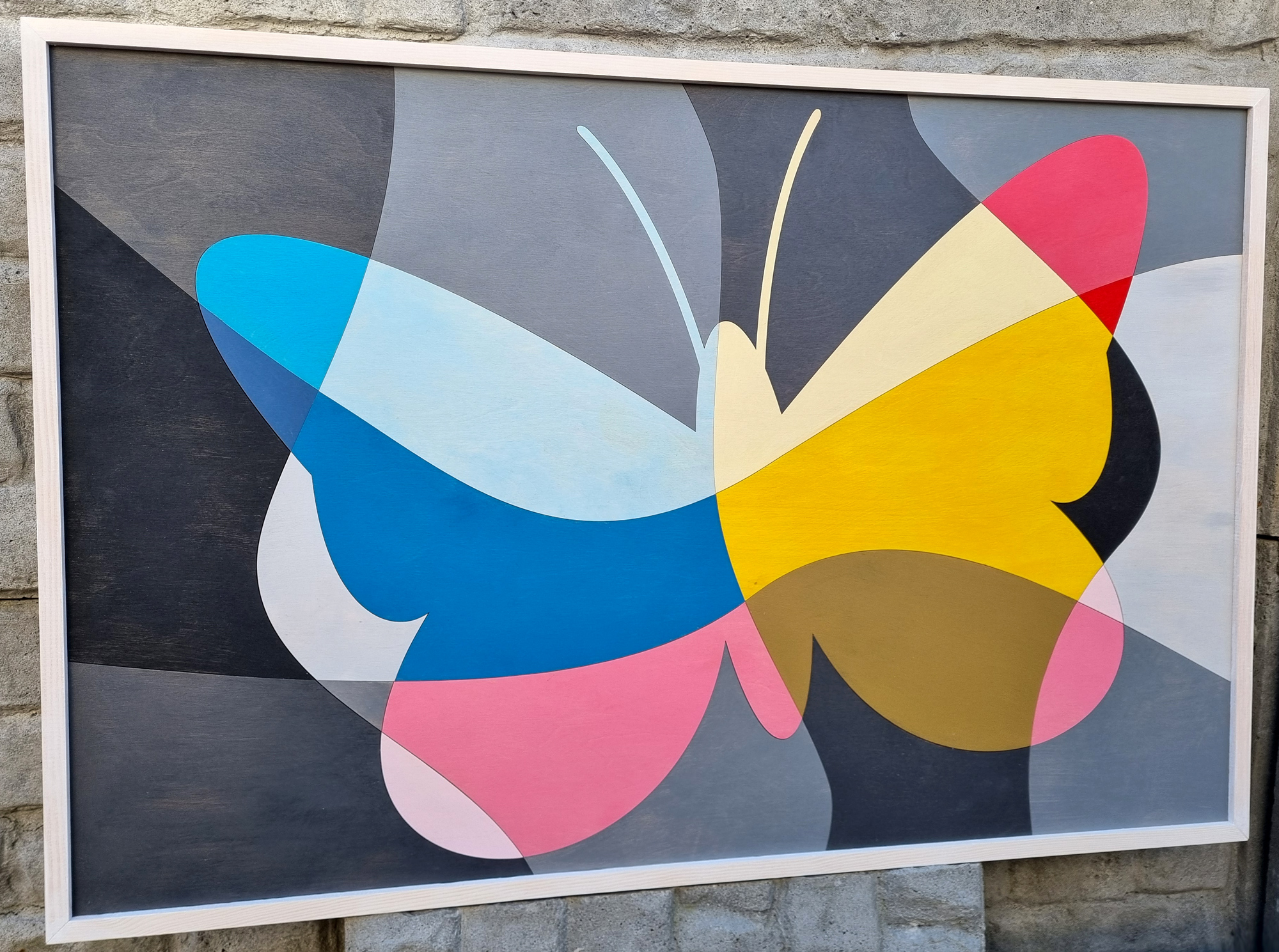 Obraz wykonany na drewnianej sklejce brzozowej. Głównym elementem obrazu jest motyl, przedstawiony w minimalistycznej abstrakcyjnej postaci. Obraz w drewnianej, sosnowej ramie.