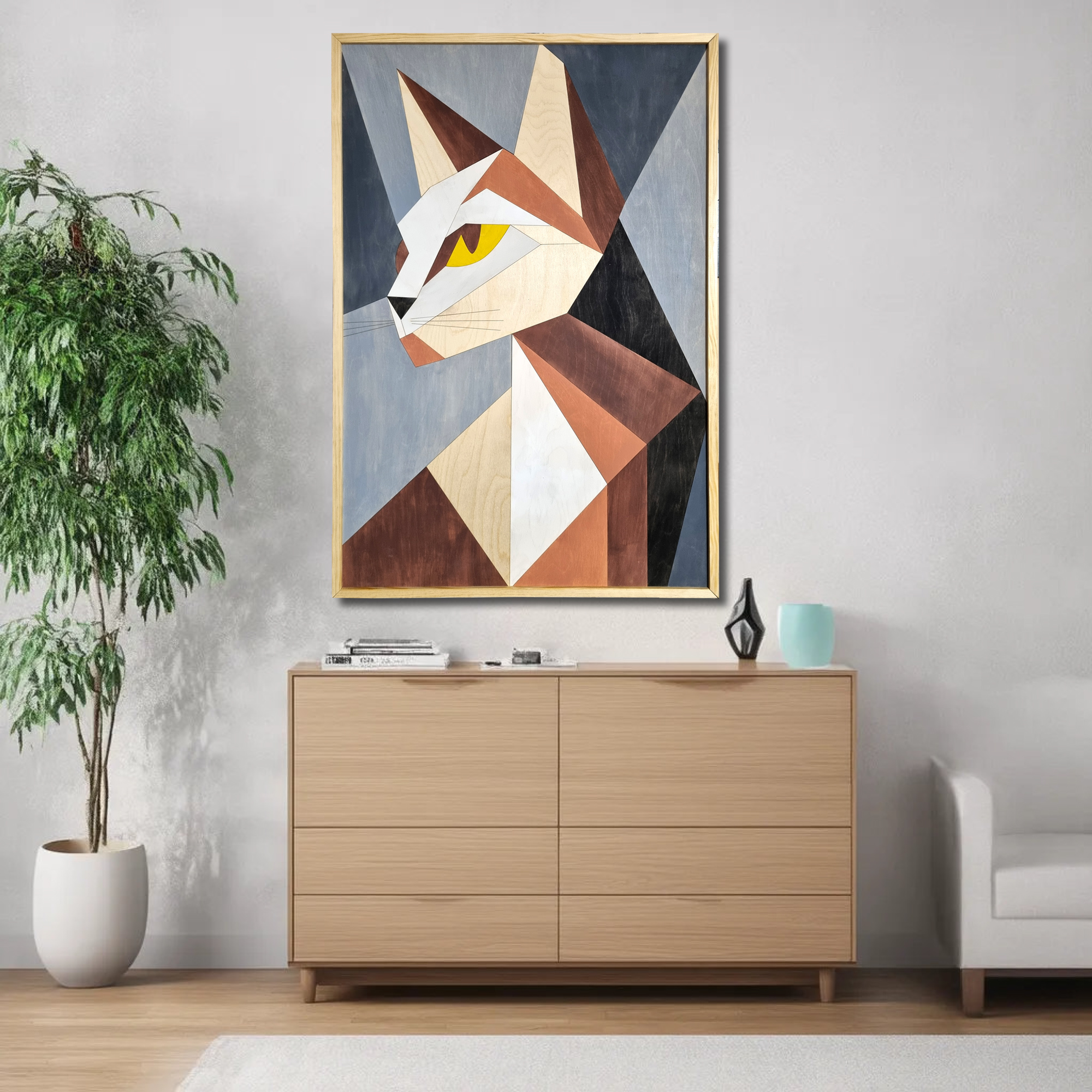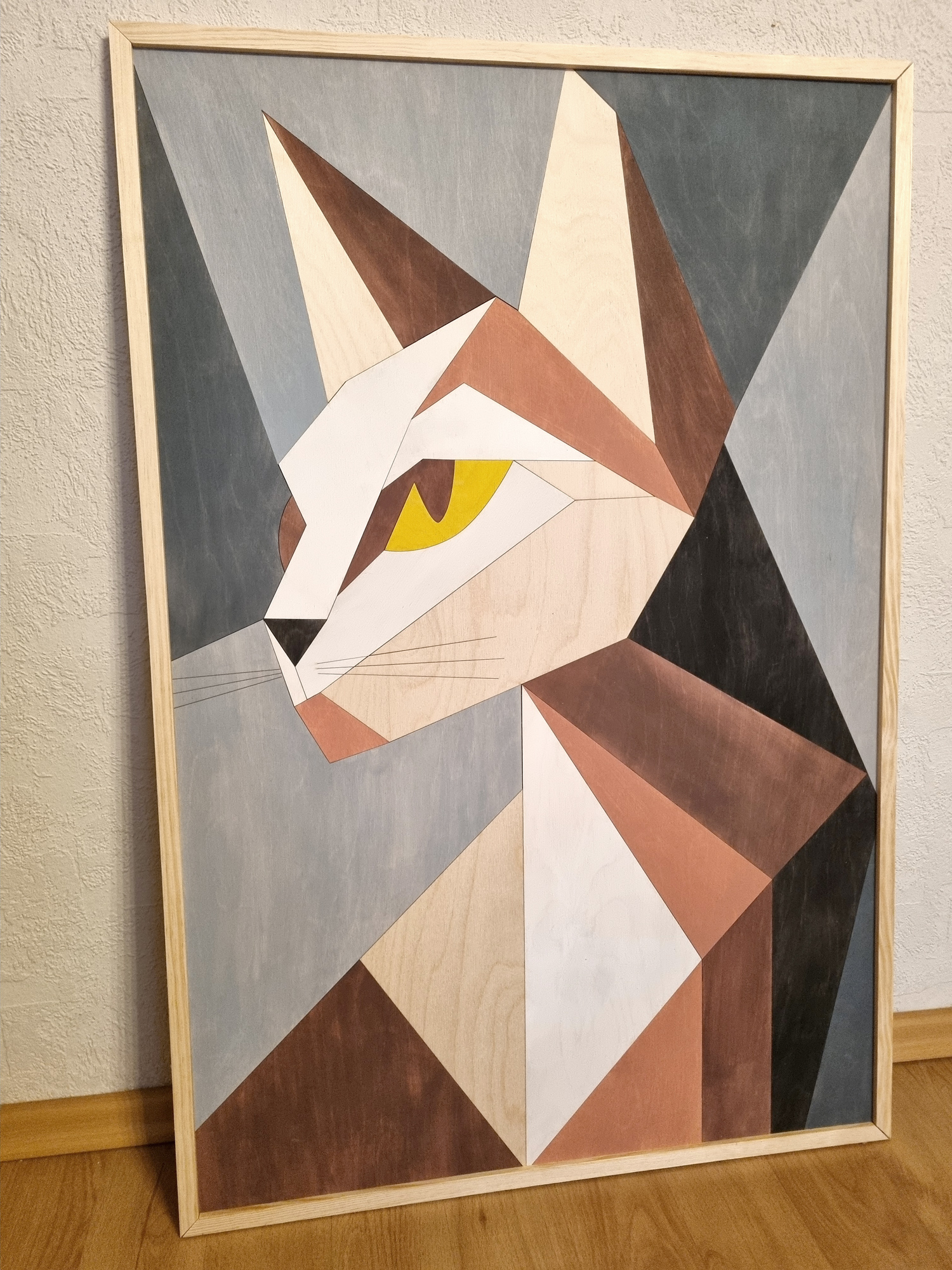Obraz wykonany na drewnianej sklejce brzozowej. Obraz z kotem, w nowoczesnym, kubistycznym stylu. Obraz w drewnianej, sosnowej ramie.