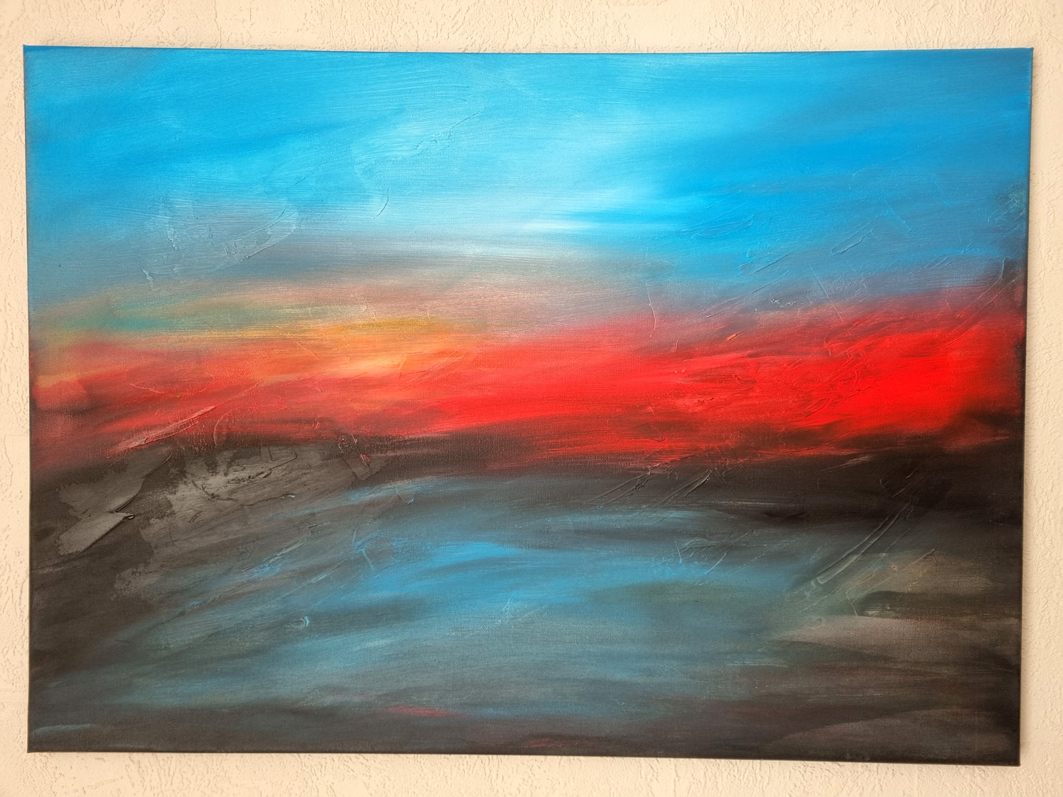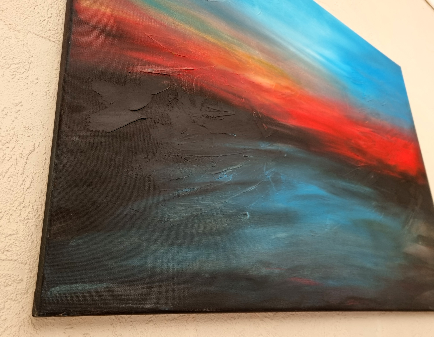 Ręcznie malowany obraz akrylowy na płótnie. Obraz z wyraźnie widoczną strukturą. Tytuł obrazu - "Zachód słońca".